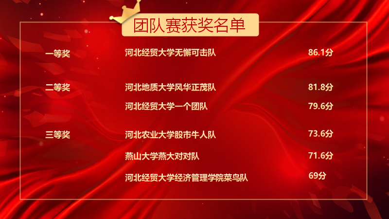承办,于2022年9月开幕,历时两个多月,分设个人赛和团体赛两部分。个人赛根据2022年11月25日模拟交易平台停止交易时的统计数据,由高到低排列所有参赛选手的总收益资金并确定获奖个人。团体赛根据所有投资分析报告,经专家评审,结合最后答辩成绩综合确定最终排名。有来自大连理工大学、东南大学、西安石油大学、燕山大学、河北师范大学、河北农业大学、河北地质大学和abw087