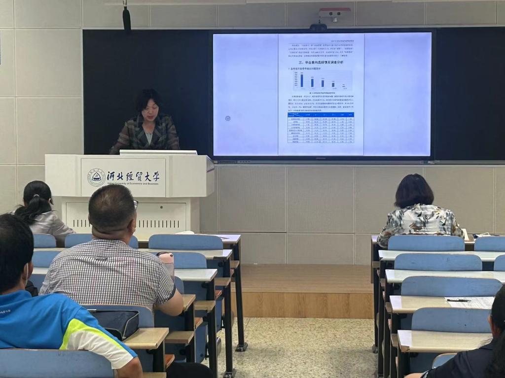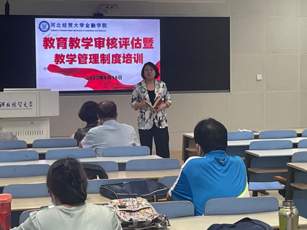 学院副院长窦丽琛做主题培训。她首先强调了本科教育教学审核评估知识学习的重要性,带领大家集体学习了相关知识,尤其是学校新财经人才培养目标、培养特色、培养模式、专业人才培养学分结构等内容,并对课堂教学、课程资源建设等方面提出了要求。然后,她为大家梳理了学校的一系列规章制度,制作了共享学习文档,并带领大家集体学习了《abw087