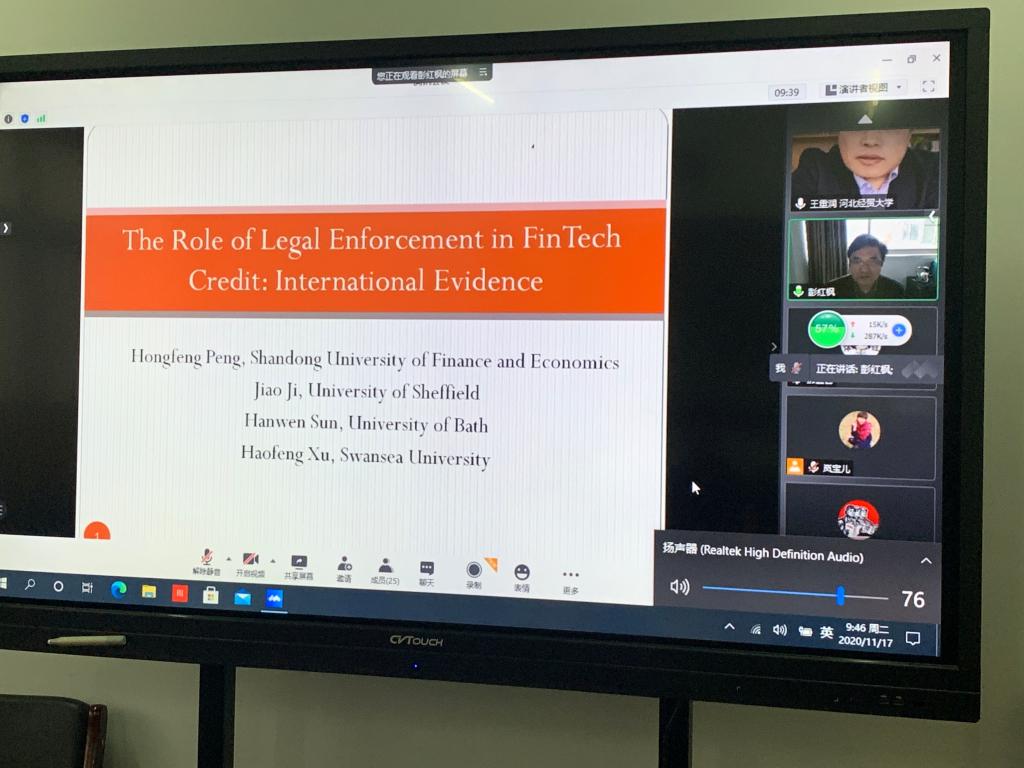 彭红枫首先在报告中对其研究做出了两个假设:一是借款人管辖范围内的法律执行质量与金融科技贷款价格呈负相关,二是如果贷款是由具有更有效的风险分担工具的平台发放的,那么法律执行在降低利率方面的作用就不那么明显了。随后,彭红枫阐述了合同的可执行性的重要性,这将深刻影响金融科技贷款定价的跨国差异。最后,彭红枫分别从金融科技诉讼涉及复杂的法律关系、数字化司法证据和无担保个人贷款等几个方面阐述了金融科技贷款的革新之处,并指出对于法院来说,强制收取拖欠贷款是一个挑战。报告结束之后,彭教授与线上师生交流讨论。