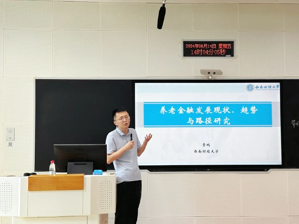 第44期金融大讲堂在三教B205教室如期举行。本期讲堂邀请到了西南财经大学习近平经济思想研究院副教授、博士生导师景鹏,并为大家带来了一场主题为“养老金融发展现状、趋势与路径研究”的学术讲座。本次讲座由副院长范庆祝主持,院长杨雪美以及部分教师、研究生参与了此次学术交流活动。