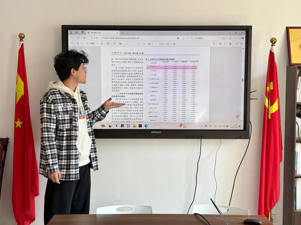 李苏霖对该论文进行了详细解读,阐述了研究背景、方法与结论。研究发现,家庭中未成年子女的存在及其数量的增加,显著提高了家庭参与商业保险的概率和保费支出,这一现象在不同家庭特征中表现出显著的异质性。李苏霖的讲解清晰明了,引发了在场师生的热烈讨论。随后范院长也为同学们今后的科研工作提出了宝贵意见。他强调,科研选题应紧密结合社会热点与实际需求,注重数据的准确性和分析方法的科学性。此外,他还提醒同学们在研究过程中提高对自己的要求,深入挖掘数据背后的经济逻辑,以提升研究的深度和广度。