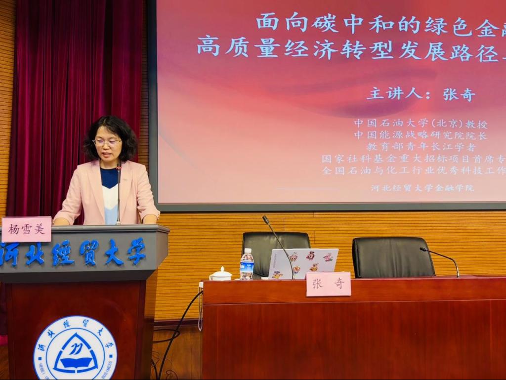 在国际学术报告厅成功举办第五十一期金融大讲堂。本期金融大讲堂邀请中国石油大学教授、中国能源战略研究院院长、国家社科基金重大招标项目首席专家张奇教授作题为“面向碳中和的绿色金融助推高质量经济转型发展路径与策略研究”的报告, abw087