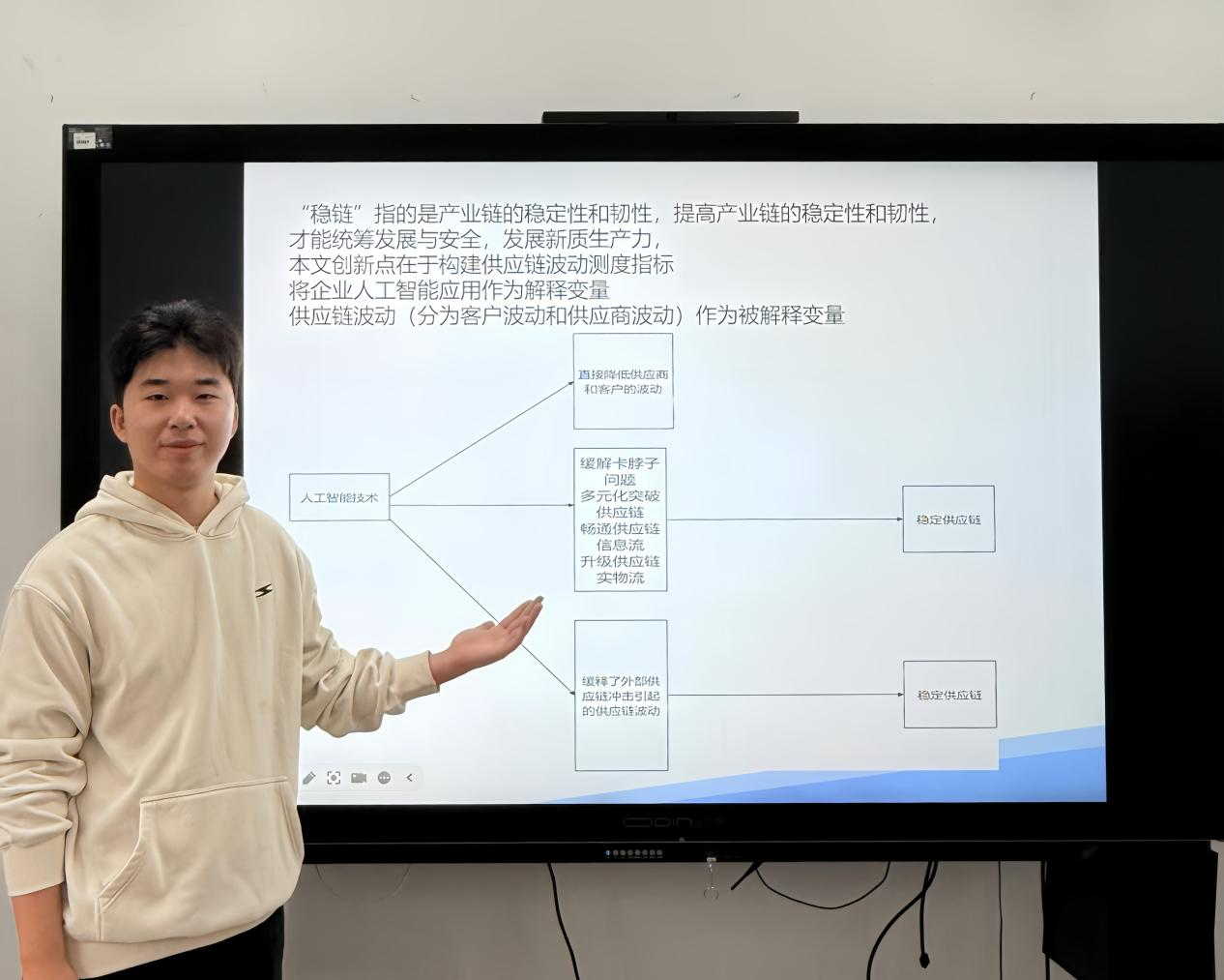 王竞攀介绍文章基于2009-2022年A股上市公司数据,运用工具变量法、双重差分法等多种计量方法展开研究。研究发现人工智能显著提升了供应链稳定性,其作用通过多元化突破、信息畅通和实物流升级三条路径实现;在创新能力强、供需不确定性高的企业中,这一效应尤为显著。研究还发现,人工智能不仅未限制创新,反而在动态环境中发挥“保稳促新”的双重作用,为推进“人工智能+”供应链行动提供了重要政策启示。