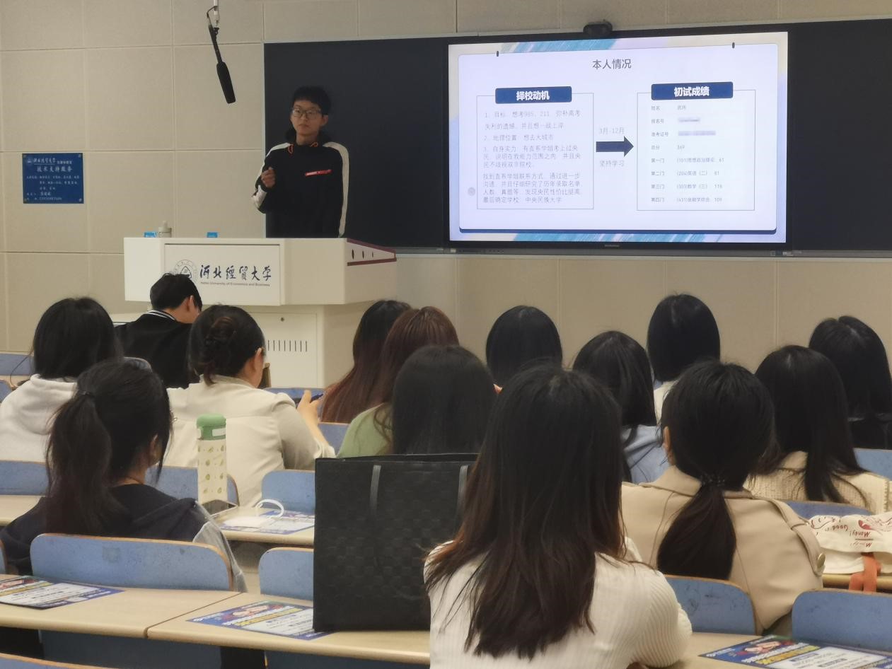 几位优秀毕业生分别对自己的考研历程作了回顾,并就院校选择考虑因素、复习时间节点安排、考研资料及参考书目选择、如何调整备战心态缓解学习压力、复试准备与应对技巧以及如何把握调剂形势和调剂机会等方面做了详细的讲解。还与学生进行了交流互动,解答回应同学们提出的关于学业与生活上的种种问题,并耐心为同学们释疑解惑,并鼓励准备考研的同学们保持好心态。