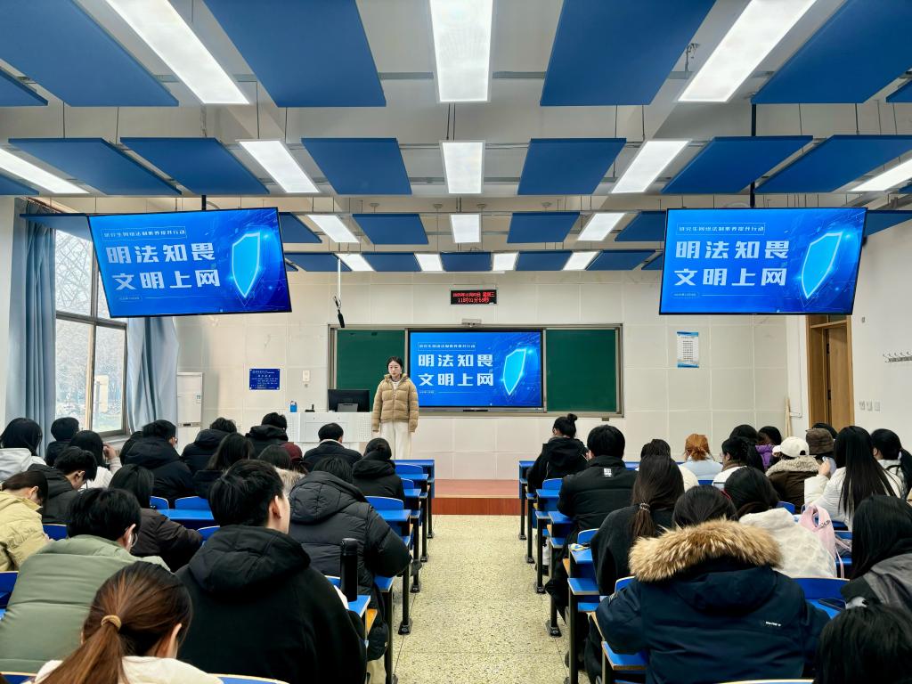 研究生于12月3日上午11:00举办“明法知畏·文明上网”研究生网络法治素养提升主题班会,100余名研究生到场参与。