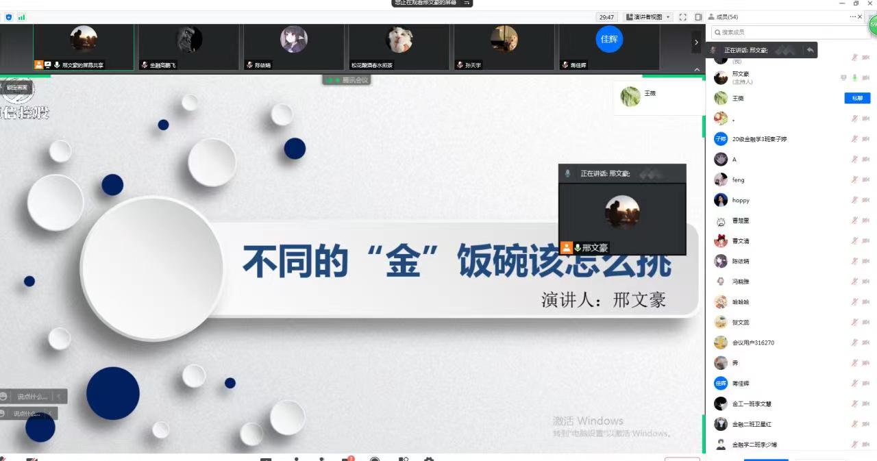 校友、青岛恒信控股石家庄交易团队负责人邢文豪以线上形式为学院学子做了题为《不同的金饭碗该怎么挑》的辅导讲座。 abw087