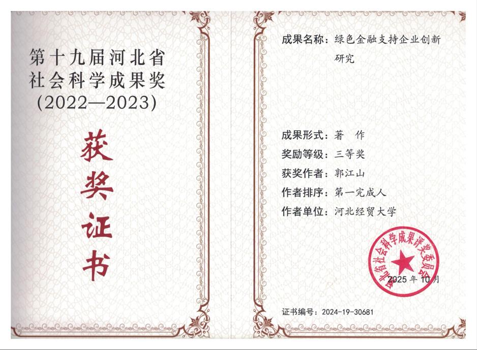 郭江山副教授荣获第十九届河北省社会科学成果奖三等奖。